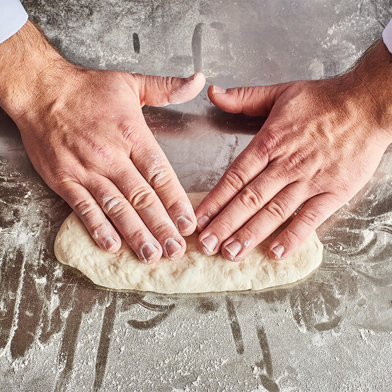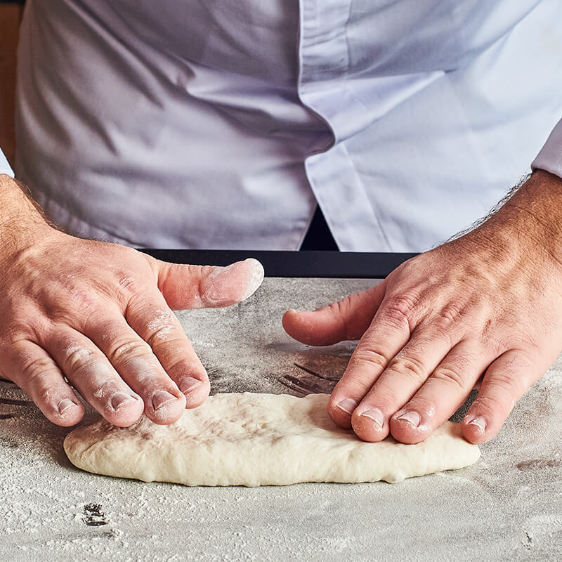 Voeg de tarwebloem, de desem, het zeezout en de 300 gram water aan de kom van een standmixer met deeghaak toe. Verkruimel de verse gist boven de kom. Kneed op medium snelheid tot een soepel en elastisch deeg. Voeg de 30 gram water toe en kneed kort totdat dit door het deeg is opgenomen. Het deeg moet een temperatuur hebben van 24 °C, deze kun je meten met de Instant Read Thermometer. Je kunt het deeg natuurlijk ook met de hand kneden.