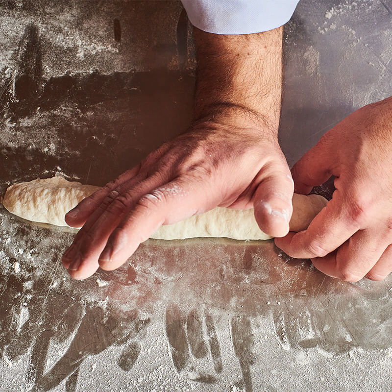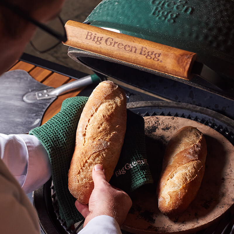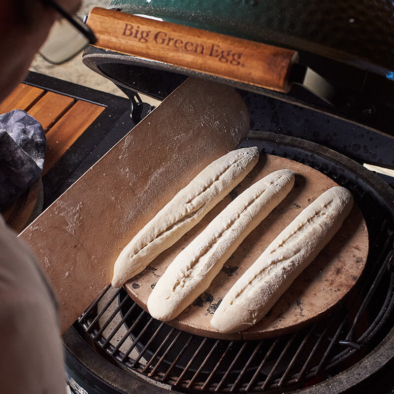 Til de hete Baking Stone even op (gebruik hiervoor de EGGmitt) en schenk 100 milliliter water in de skillet. Pas op, omdat de skillet zeer heet is zal er direct stoomvorming ontstaan. Leg de Baking Stone terug en leg hier de deegstukken op. Sluit de deksel van de EGG en breng de temperatuur van de EGG terug naar 250 °C. Bak de baquettes in ca. 20 minuten goudbruin en gaar.