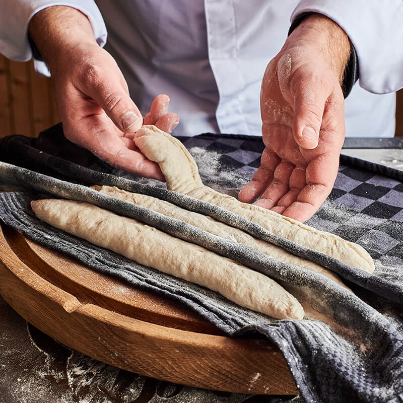 Duw wat van de lucht uit de deegstukken door ze iets platter te drukken en rol de stukken op tot baguettes. Leg de deegstukken tussen twee met bloem bestoven theedoeken en laat 60 minuten rijzen.