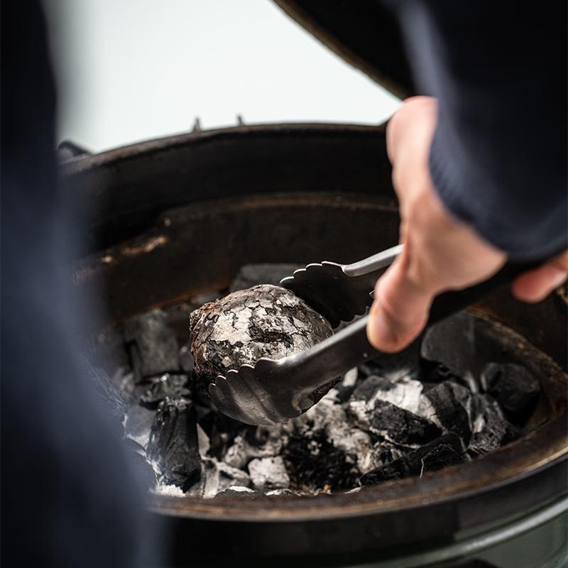 Leg de rode biet in de houtskool en sluit de deksel van de EGG. Pof de rode biet ca. 60 minuten totdat deze zacht is; keer de biet tijdens het poffen af en toe om en sluit na elke handeling de deksel van de EGG.