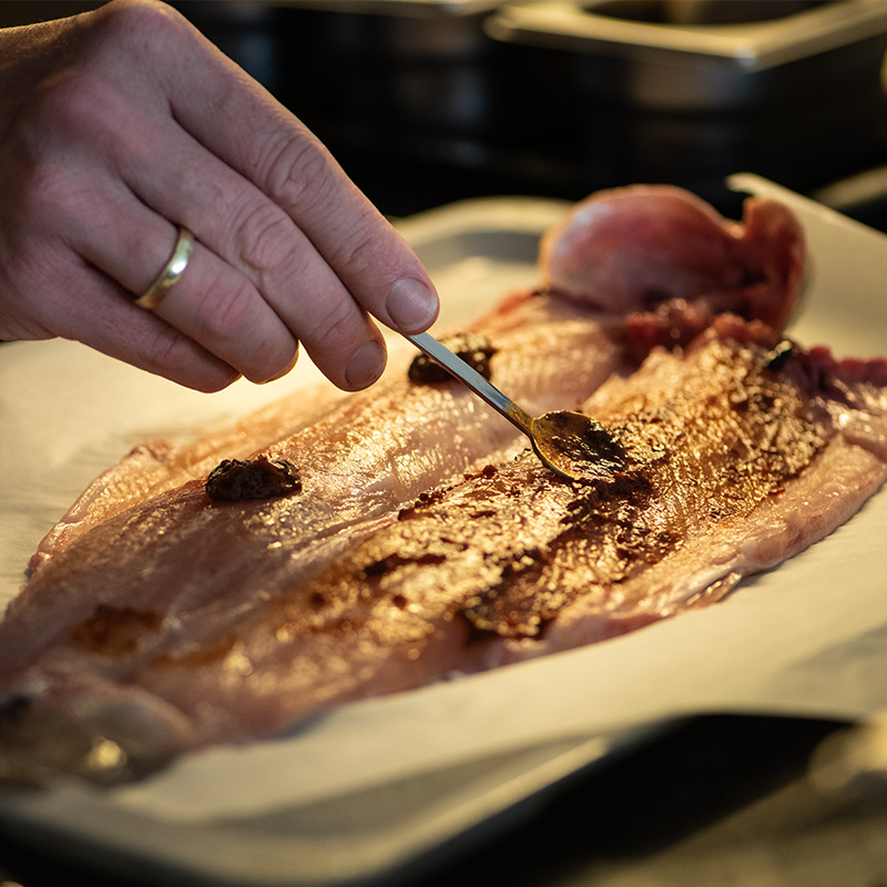Haal de biet uit de EGG en laat deze enigszins afkoelen. Leg de Stainless Steel Grid in de EGG en breng de temperatuur naar 200 °C. Vlinder intussen de bronforel door de buikwand open te snijden en de ingewanden te verwijderen. Knip de buikgraat aan beide kanten door en snijd met je fileermes van kop naar staart aan beide kanten tussen de graten en het visvlees door; snijd niet door de huid heen. Trek de middengraat los of knip deze door. Verwijder de kieuwen.