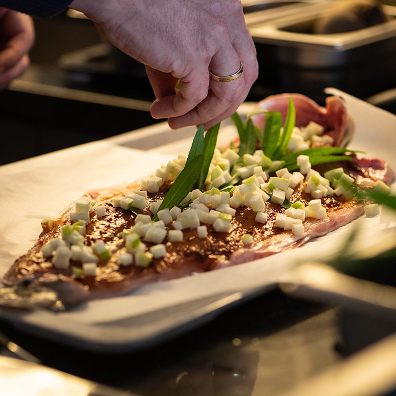 Snijd de Granny Smith in plakjes van ongeveer 1 centimeter dik en snijd deze in blokjes. Pel de schil van de rode biet en snijd ook deze in blokjes van ca. 1 centimeter. Leg de tak dragon in het midden van de vis en verdeel hier de appel- en bietenblokjes over. Bestrooi met versgemalen zeezout naar smaak.