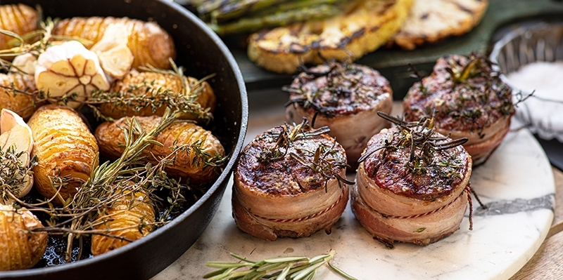 Je kunt de tournedos serveren met bijgerechten naar keuze, zoals gegrilde groenten en hasselback aardappels. Maak dan eerst de aardappels, gril daarna de groenten en tenslotte de tournedos. Als de tournedos rust kun je de aardappels en de groenten nog even opwarmen.
